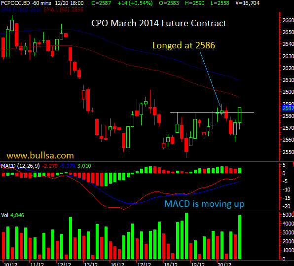 I initiated long position for CPO March 2013 Future Contract at 2586 for 1 contract.